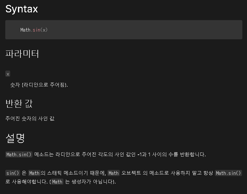 이번엔 모질라 문서에서 직접 Math객체의 내용을 읽고 sin과 관련된 코드를 작성하는 것 이었다.