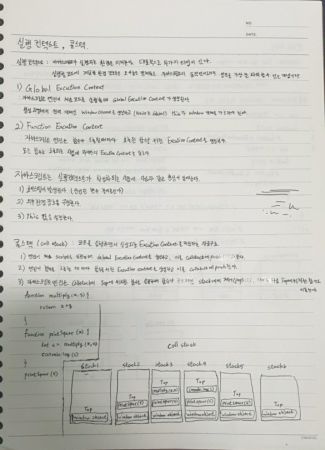 콜스택 (call stack) : 코드를 실행하면서 생성되는 Excution Context를 저장하는 자료구조