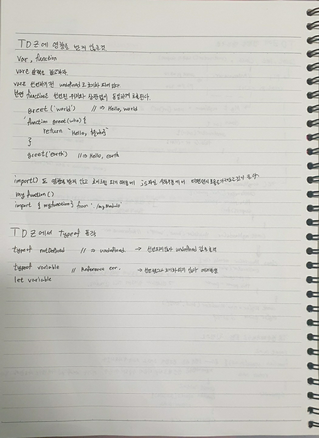 마지막으로 import도 TDZ에 영향을 받지 않고 호이스팅되기 때문에 JS파일 시작에서 디펜던시 모듈을 가져올때 사용한다.