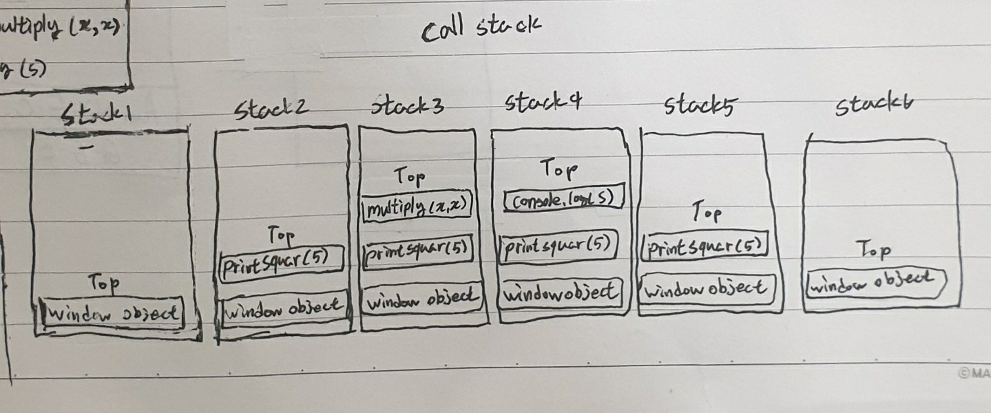 3) 자바스크립트엔진은 callstack의 Top에 위치한 함수를 실행하며 함수가 종료되면 stack에서 제거(pop)하고