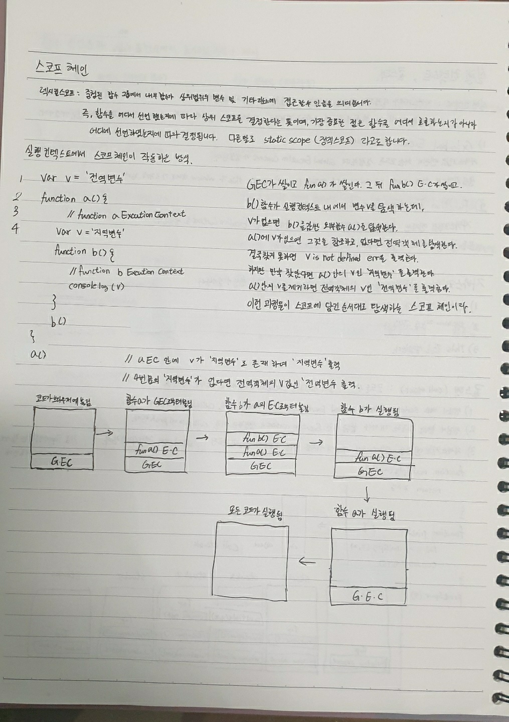 이런 과정들이 스코프에 담긴 순서대로 탐색하는 스코프 체인이다.