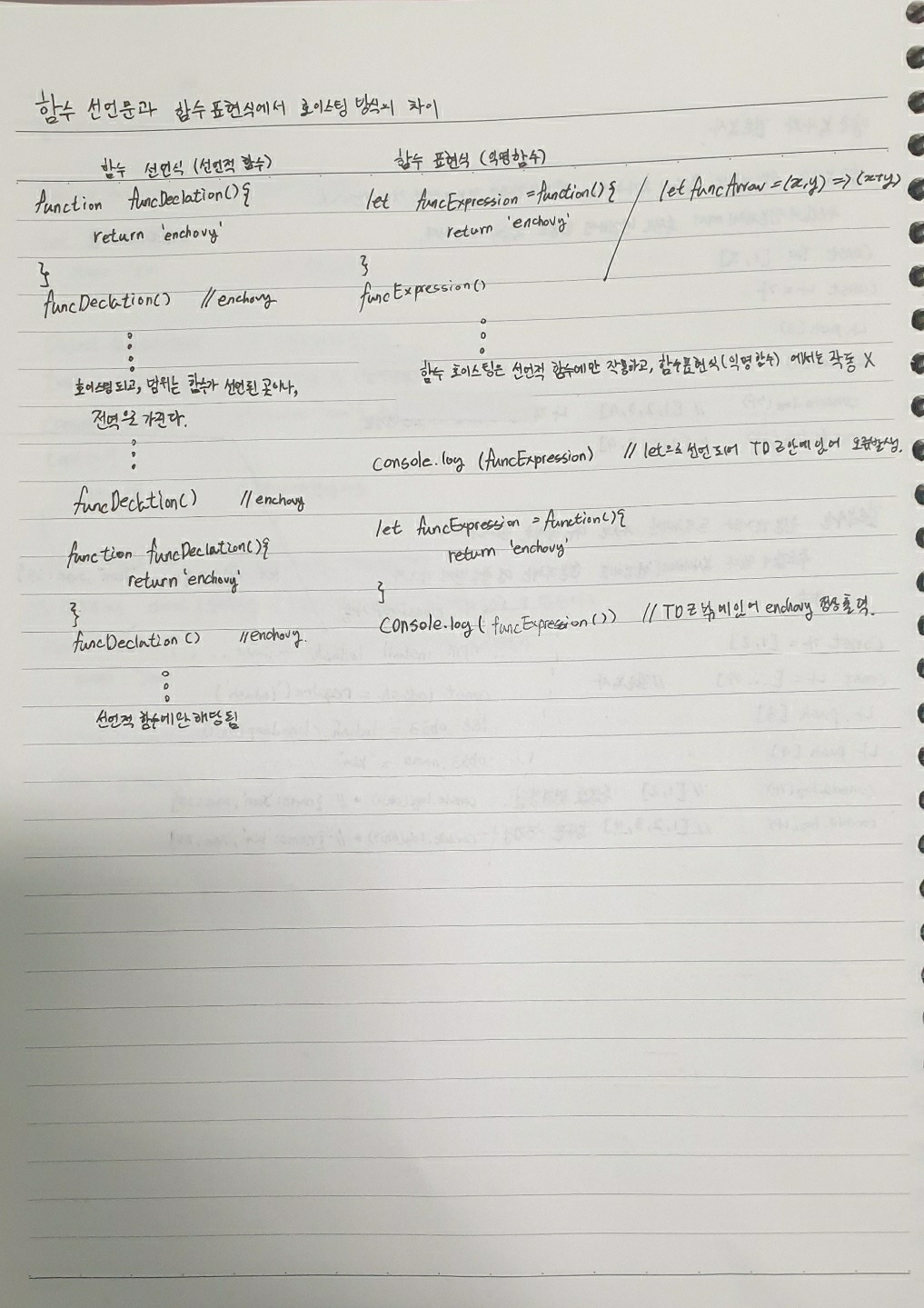 함수에서의 호이스팅은 함수선언문(선언적 함수)에서만 작용하고 함수표현식(익명함수)에서는 작동하지 않는다.