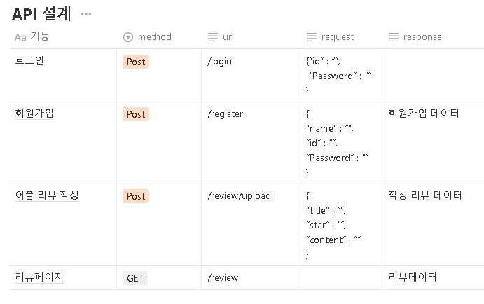 이번 풀스택 프로젝트때 처음 작성했던 API설계이다.