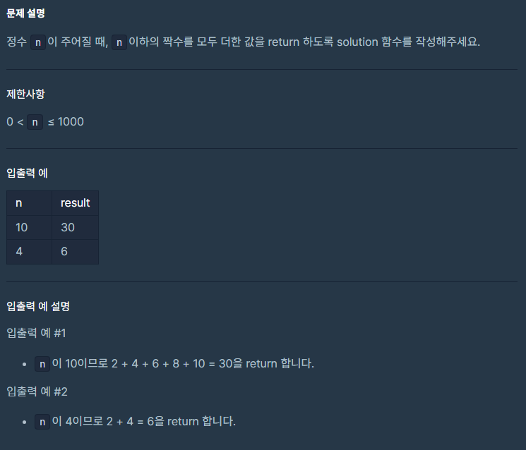 반복문만을 활용하여 i가 2부터 시작해 짝수로만 증가하게하고 n까지 비교하여 더하도록하였다.