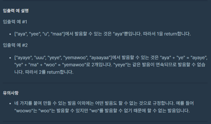 반복문을 사용하여 인자인 babbling 각 요소에 대해 판별할 수 있게 하였고, 중첩반복문을 사용하여 각 요소마다 발음가능한 단어의 최소반복(2회)가 포함되어있는지 먼저 판별하였다.