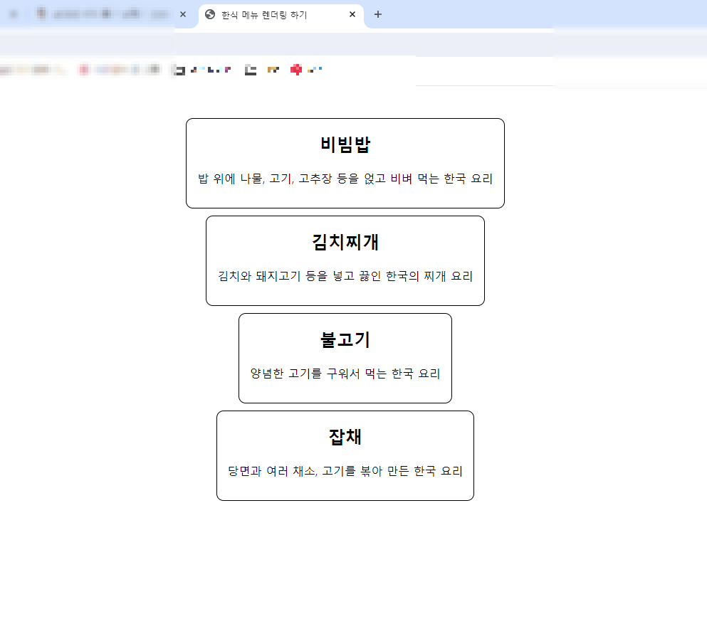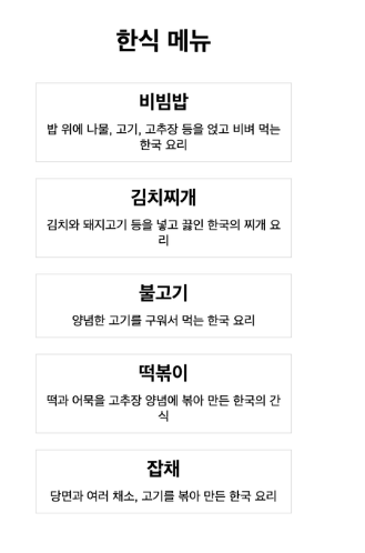 { name: '불고기', description: '양념한 고기를 구워서 먹는 한국 요리' },