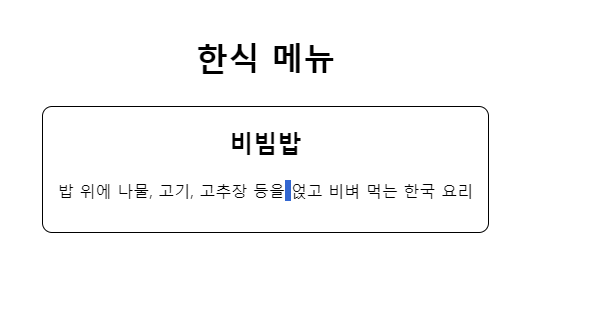 { name: '비빔밥', description: '밥 위에 나물, 고기, 고추장 등을 얹고 비벼 먹는 한국 요리' },