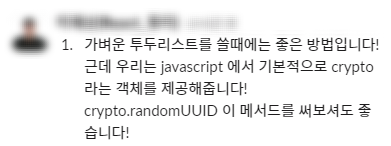 슬랙을 통해 튜터님께 질문드린 결과 crypto.randomUUID를 사용해보라고 추천해주셨다.