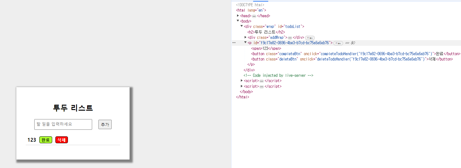 이렇게 ${id}를 큰 따옴표로 감싸주어 자바스크립트가 onClick에 전달된 함수를 'deleteTodoHandler("${id}")'로 완성되어 받을 수 있게 해야한다.