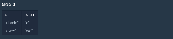 단어 s의 가운데 글자를 반환하는 함수, solution을 만들어 보세요. 단어의 길이가 짝수라면 가운데 두글자를 반환하면 됩니다.
