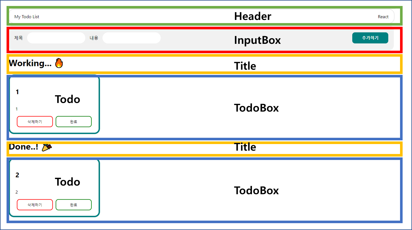 TodoList컴포넌트는 Title - Todo - Title - Todo형식으로 사용자에게 보여진다. 각 Todo는 완료된 상태에 따라 나눠지며 해당 값은 Todo의 isDone값으로 구분된다.