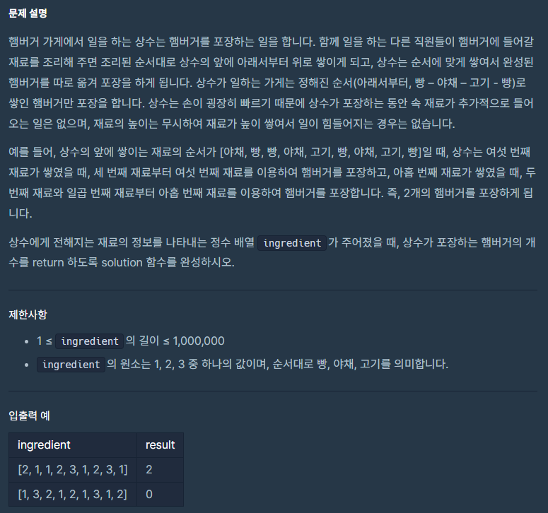 주어지는 ingredient배열 중 1, 2, 3, 1 순서로 되어있는 요소를 제거하고, 다시 제거된 배열에서 1, 2, 3, 1이 없을때까지 해당 순서의 개수를 찾는 문제이다.