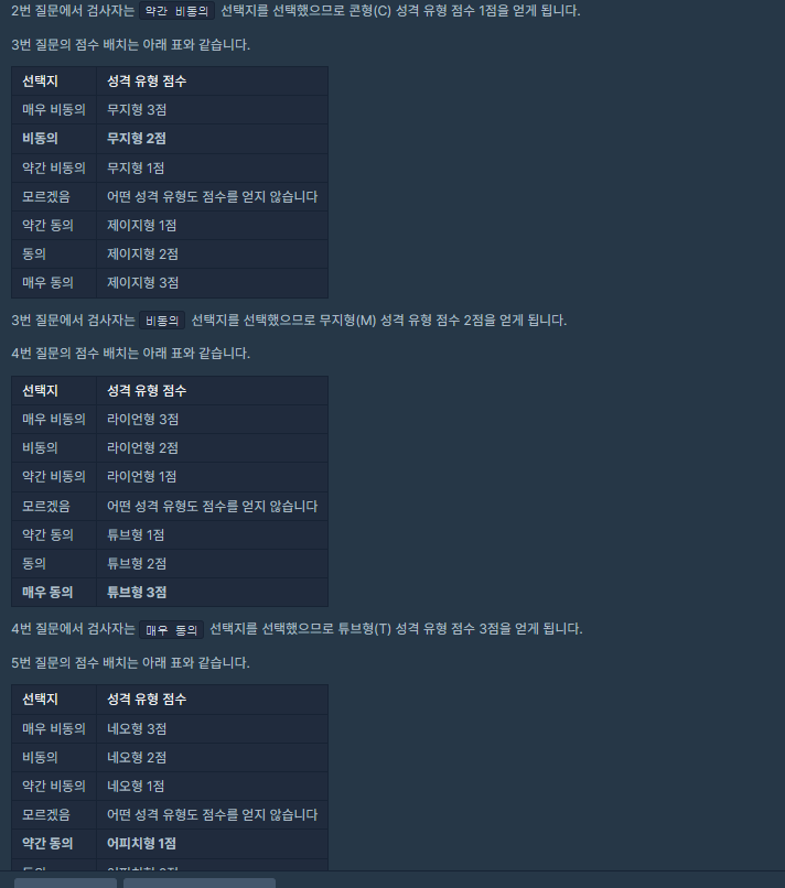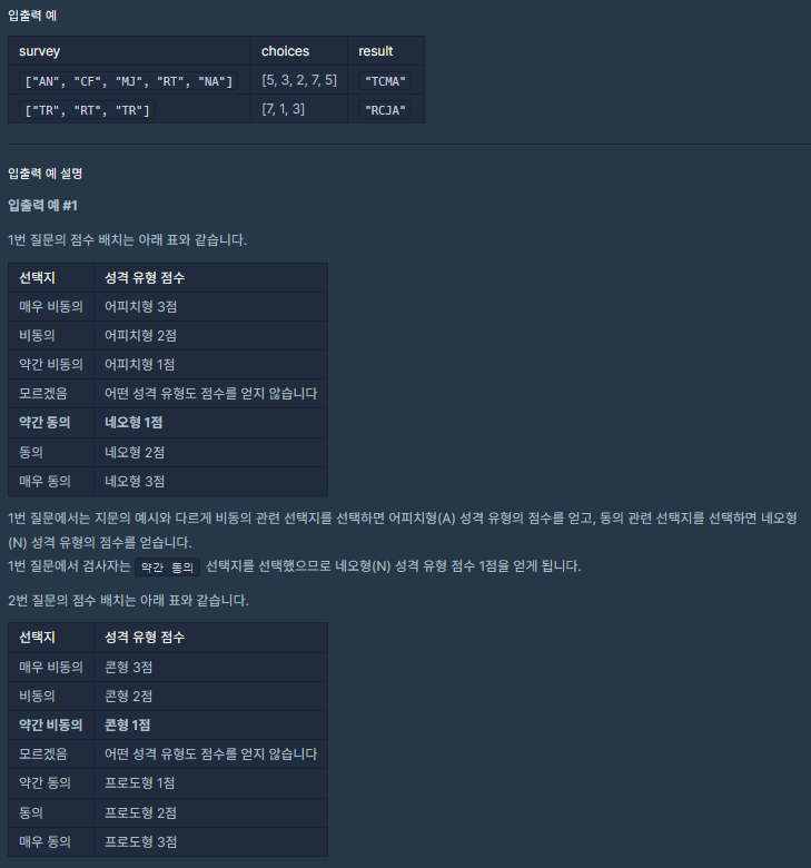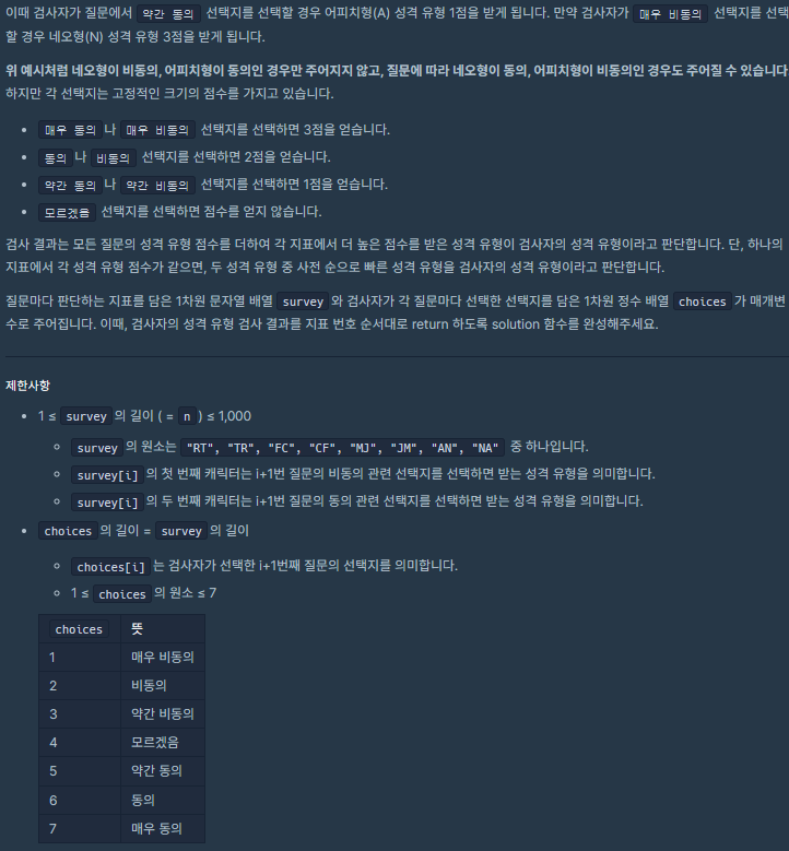 survey, choices 각 순서에 맞는 요소들이 해당 성격유형에 점수를 매기는 걸 결과를 리턴하는 함수를 만드는 것이다.