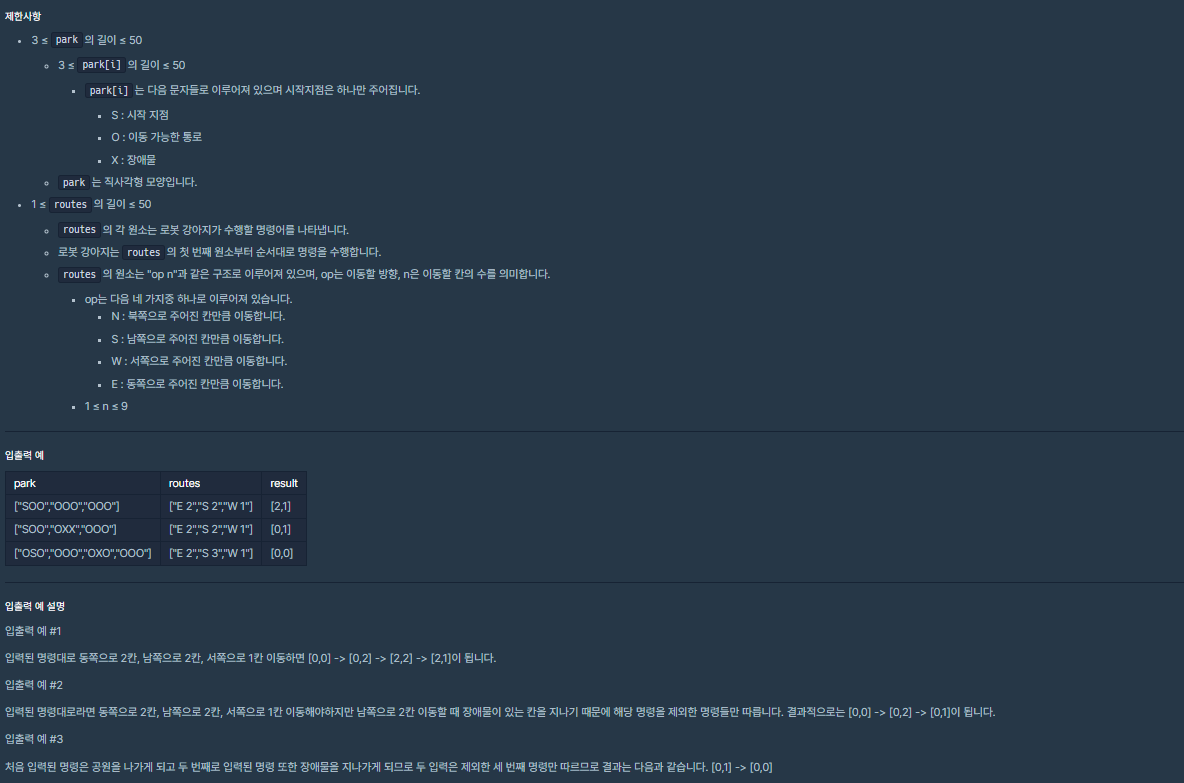 S는 더해지는 방향이므로 startY에 1을 더하고 조건문에서 공원의 최대Y길이를 벗어나는지를 포함시켰다.