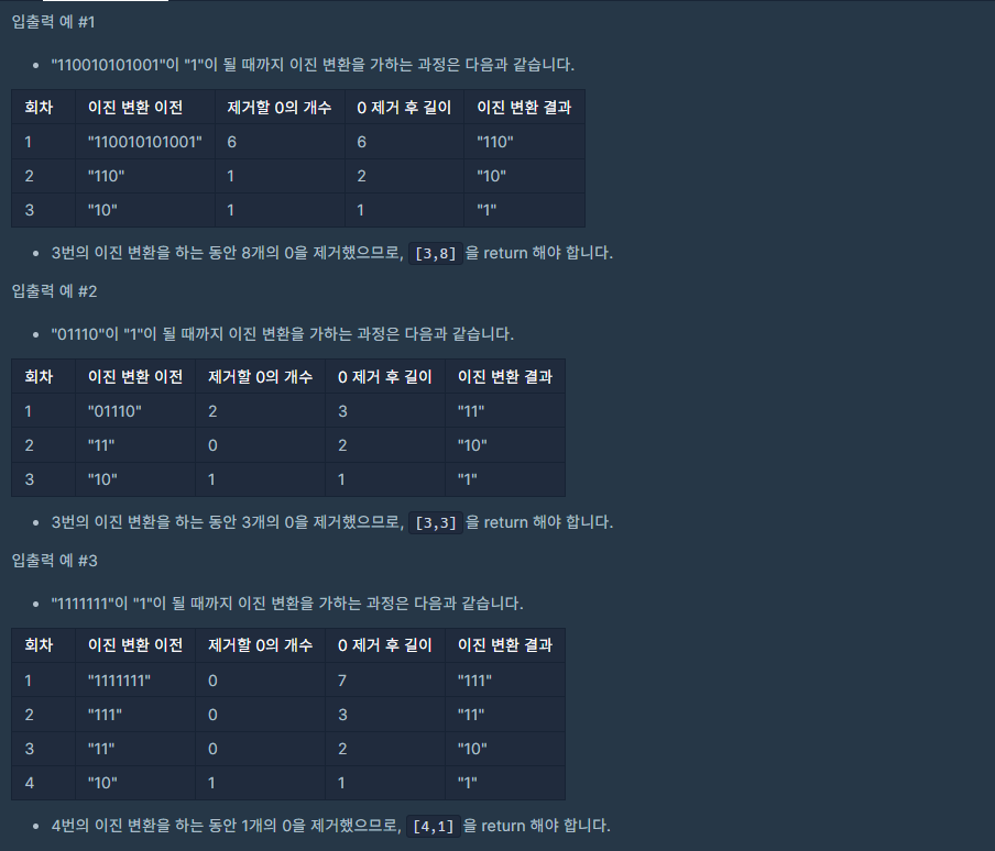 이진법 변환 횟수인 binaryNum과 없앤 0의 개수인 zeros 변수를 만든다.
