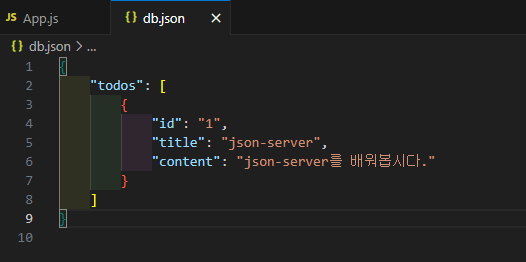 db.json 파일을 만들어 준 뒤, get요청을 확인하기 위한 원하는 모양의 데이터를 넣어준다.