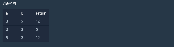 | 두 정수 a, b가 주어졌을 때 a와 b 사이에 속한 모든 정수의 합을 리턴하는 함수, solution을 완성하세요. 예를 들어 a = 3, b = 5인 경우, 3 + 4 + 5 = 12이므로 12를 리턴합니다. |