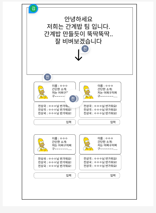 한 페이지에서 조를 소개하는 화면이 먼저 보인다. 소개하는 부분의 바로 아래에는 아래를 향하는 화살표가 존재하며