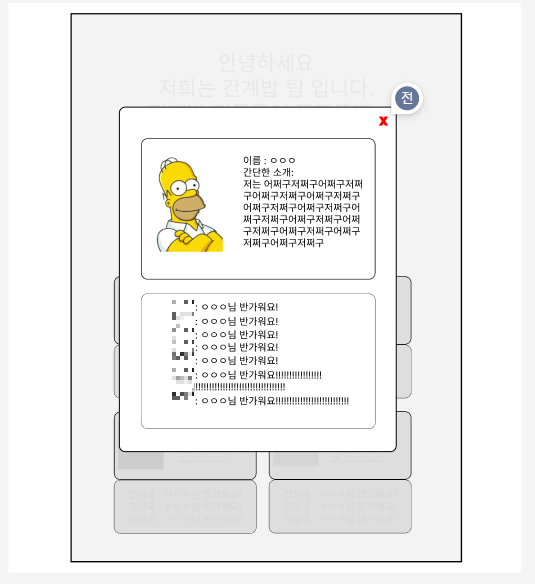 또한 각각의 멤버 카드에는 각 멤버들의 이름, 소개, 댓글목록이 간략히 보이며 소개 혹은 댓글목록을 클릭하면 상세한 내용이 나오는 모달창이 등장한다.
