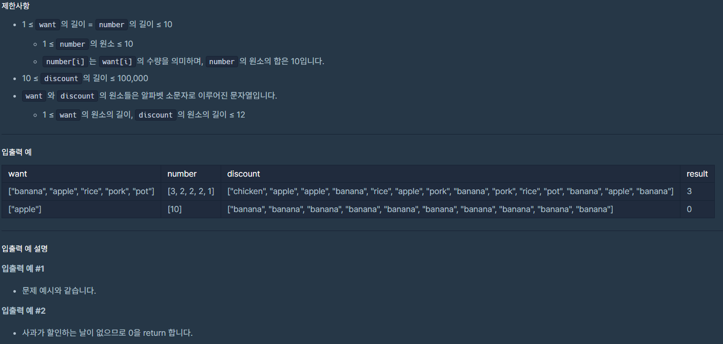 discount 배열을 10단위로 가능한 모든 경우를 잘라내어 잘라진 배열에 원하는 제품이 모두 개수가 맞게 들어있다면