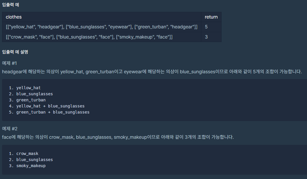그리고 각 요소를 몇종류를 입을거냐에 따라 곱하여 answer에 더해주면 되는데, 그걸 어떻게 코드를 짜야할지 생각이 안났다.