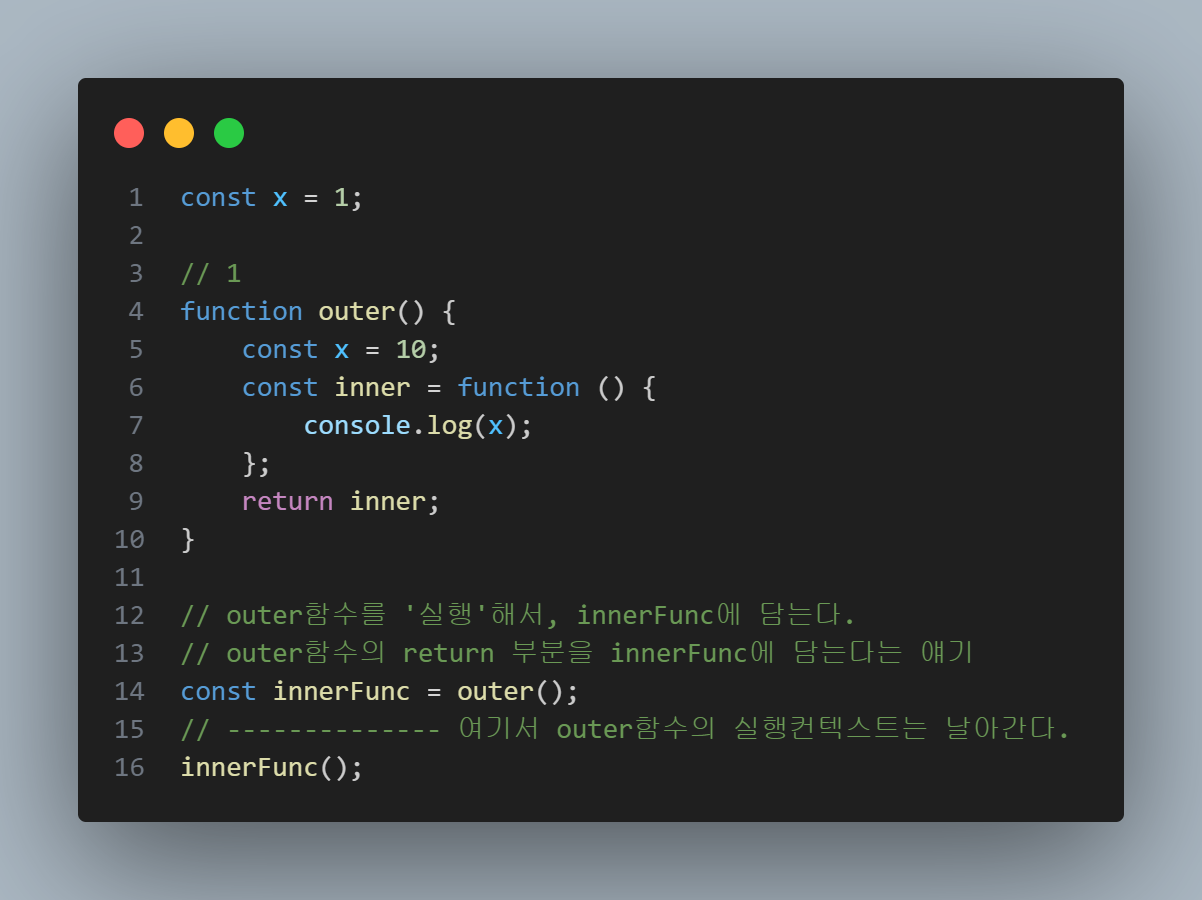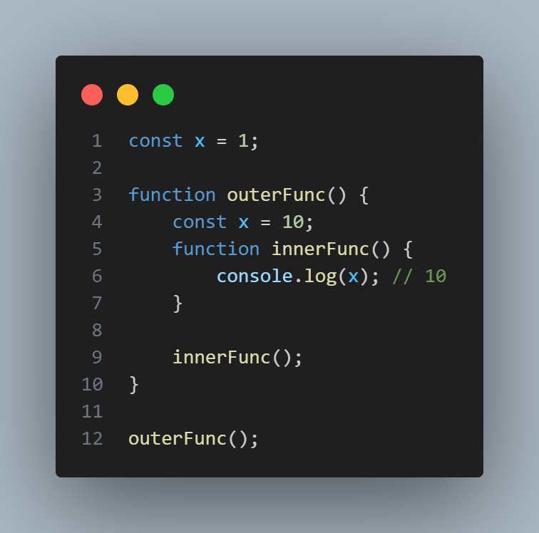 출력은 1이 나온다. outerFunc 안에 x가 10으로 할당되어있고, 그곳에서 innerFunc를 실행했기 때문에 10이 출력될 것이라고 생각할 수도 있지만,
