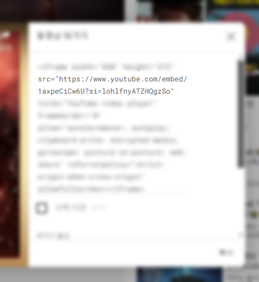 원하는 영상의 공유버튼을 누르고, <>모양을 누른다. 그러면 위처럼 iframe태그가 나오는데, 이를 복사해서 html에 넣으면 유튜브 비디오플레이어가 나오게 된다.