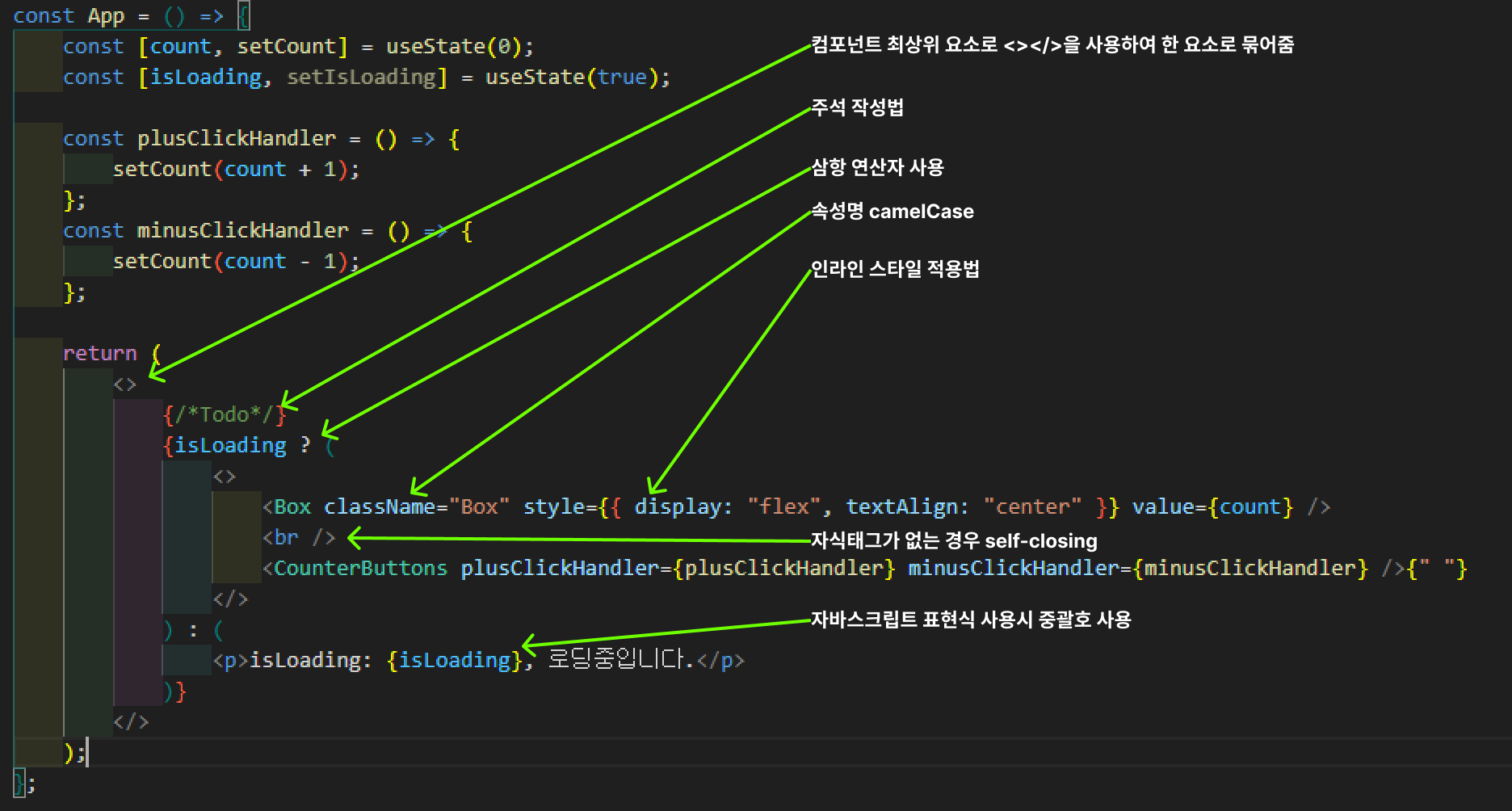 JSX는 결국 자바스크립트를 확장한 문법이다. 몇가지 규칙을 따르면 react에서 사용이 가능하다.