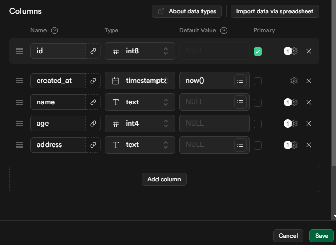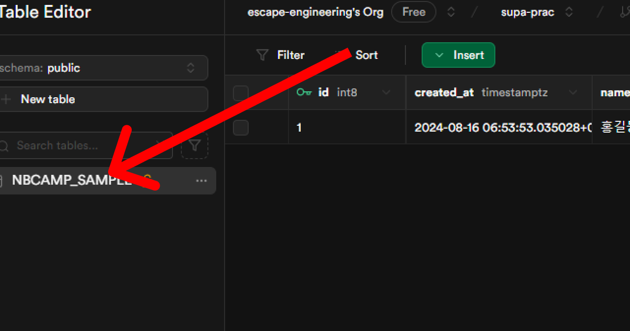 해당 프로젝트가 생성된 뒤 Table Editor을 누른다.