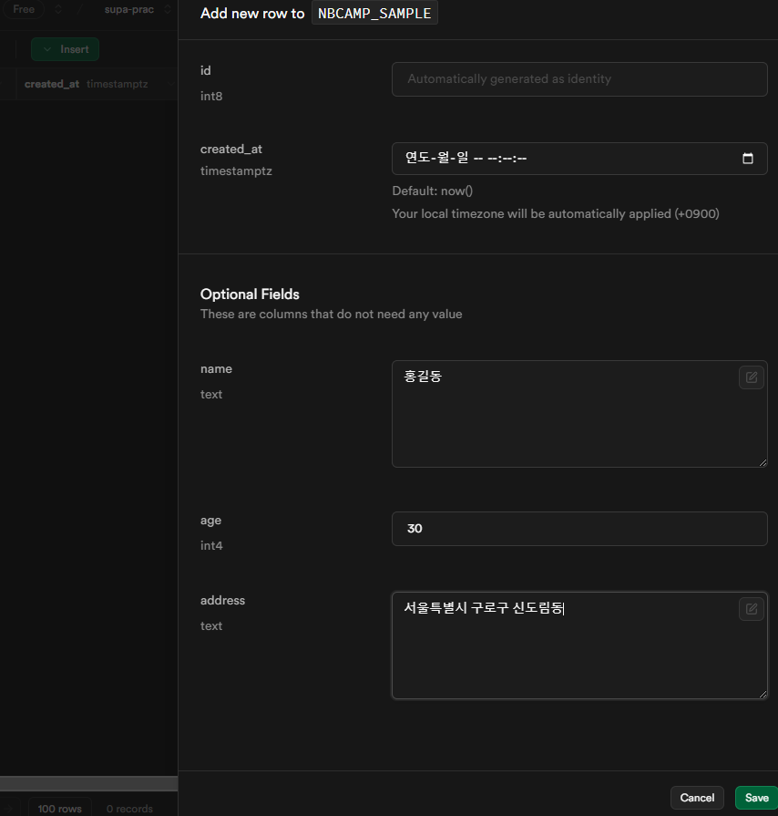 const { data, error } = await supabase.from("NBCAMP_SAMPLE").insert({