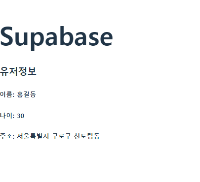 데이터 Get 요청처럼 supabase.from()까지는 동일하고, update를 사용한다. update내부에는 객체 형식으로 서버 데이터 형식과 맞게 작성해주면 된다. 여기서는 주소값만 변경하는 로직이므로 address만 들어가있다.