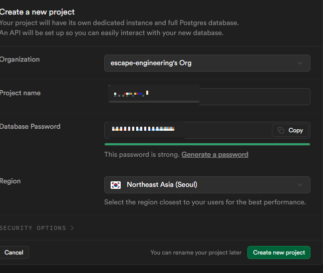 2. supabase에서 프로젝트 생성