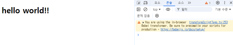그리고 아까 작성한 script에 type = 'text/babel'을 추가하여 babel이 인식할 수 있도록 한다.