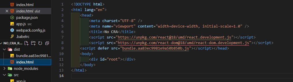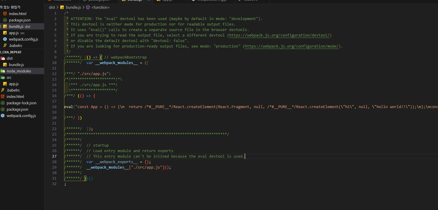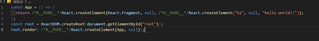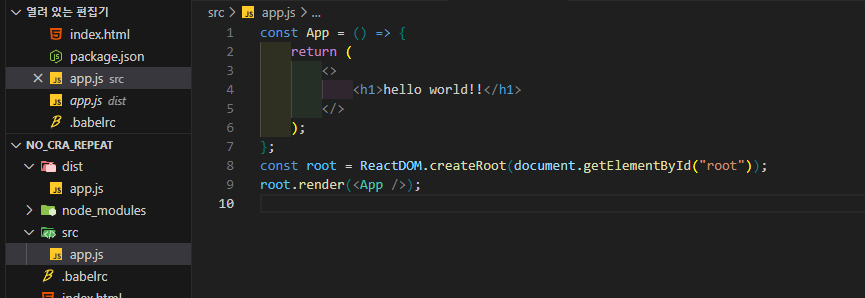 이렇게 하면 dist폴더의 app.js를 불러오는 것인데, dist폴더의 app.js는 JSX문법으로 작성한 App.js를 바벨이 빌드단계에서 해석해놓은 형태이다.