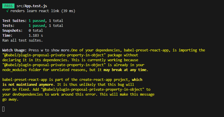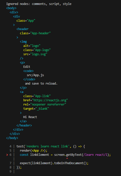너는 learn react라는 텍스트를 찾고있는데, 그건 없어! 라고 친절하게 알려준다.