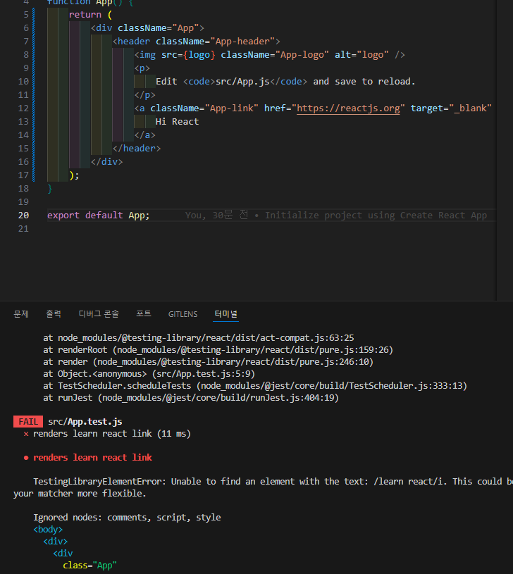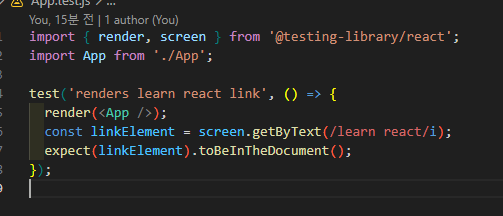 또한 기본 App.js를 위한 테스트코드도 한개가 작성되어 있다.