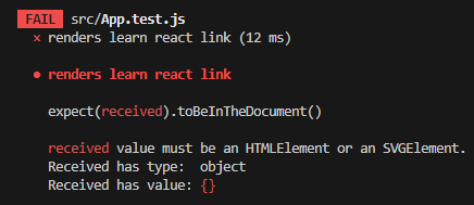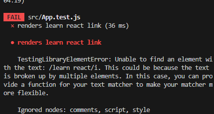 이렇게 learn react라는 문구가 없는 것을 테스팅한다면 fail을 표시해준다.