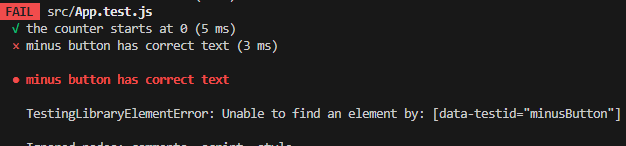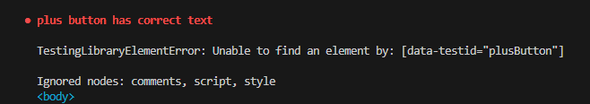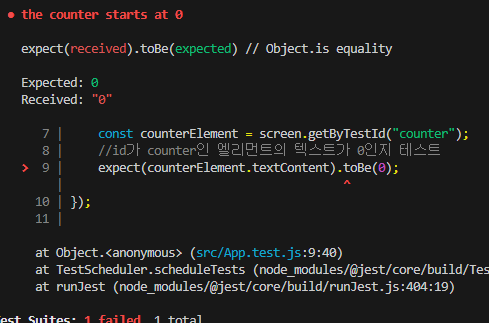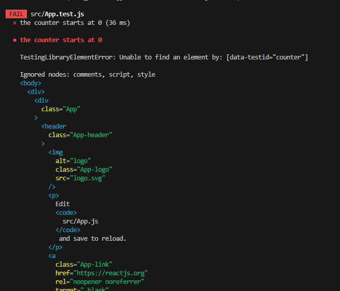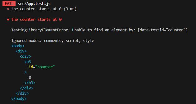 에러 메시지에 보면, data-testid가 counter인 요소를 찾지 못한다고 알려주고 있다.