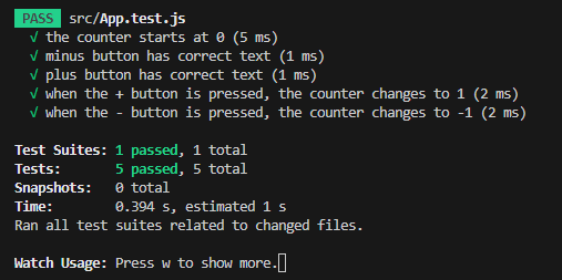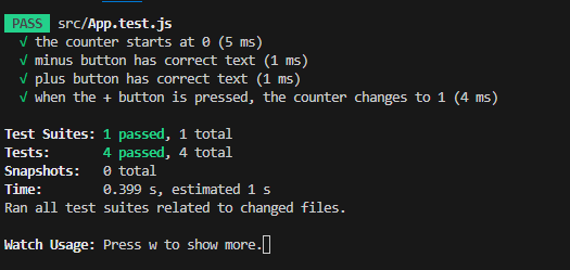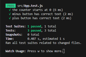 테스트가 잘 통과된 것을 볼 수 있다. 동일하게 마이너스 버튼도 작업해준다.