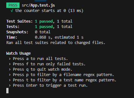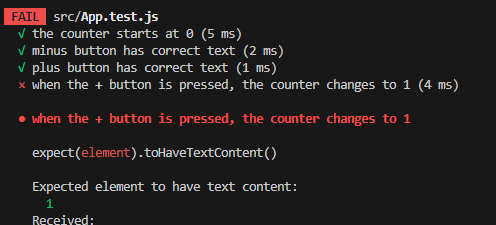 여기서 주의해야 할 점은 element.textContent로 불러온 값은 문자열로 return해주기 때문에, 아무리 count가 숫자형태의 state일지라도 문자열로 들어와 toBe(0)의 숫자와 타입이 달라 테스트 Fail을 받을 수 있다.