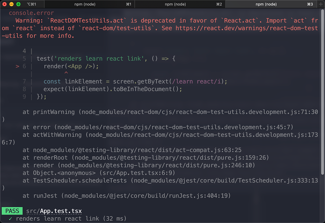테스트는 통과되었으나 이런 오류가 뜰 수 있다. 이건 testing-library의 버전이 오래된 것이 CRA를 통해 설치되어 있기 때문이라 다시 install해주면 된다.