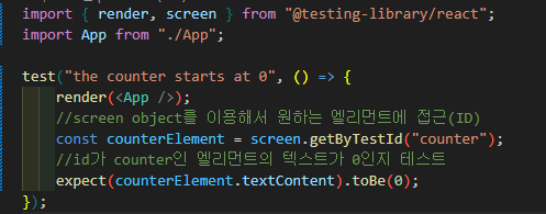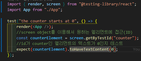 counter을 id로 갖는 요소에 접근하여 텍스트가 0일 것이라고 예상하는 테스트이다.