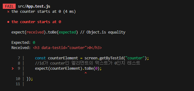 <h3 data-testid='counter'>0</h3> === 0을 비교하려고 하다보니 생긴 오류이다. 따라서 해당 요소의 textContent를 가져와야 한다.