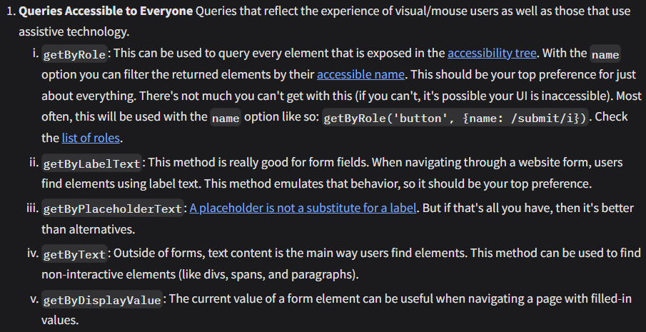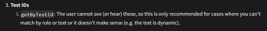 여태까지 사용했던 getByTestId는 유저가 볼수없는 영역이라 role이나 동적으로 제공되는 text라서 matching할 수 없을 때 사용해야 하는 최하위 우선순위이다.