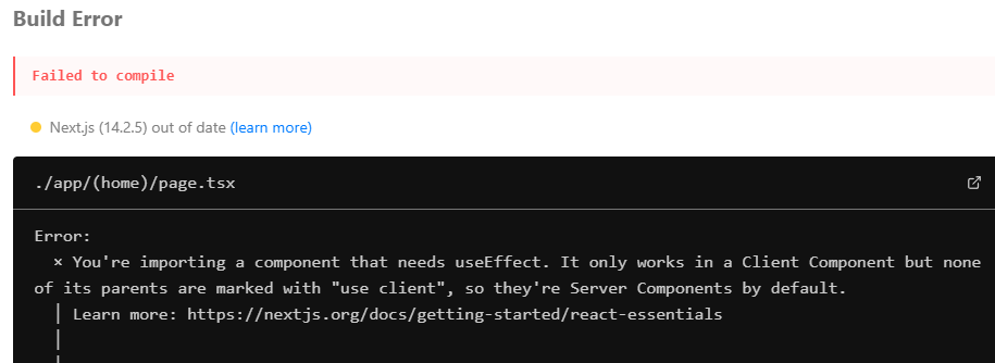 NextJS는 바로 오류를 뱉어버린다. useEffect와 같은 hook은 클라이언트 컴포넌트에서만 사용이 가능하기 때문에 use client를 코드에 작성해 클라이언트 컴포넌트로 만들라는 오류이다.