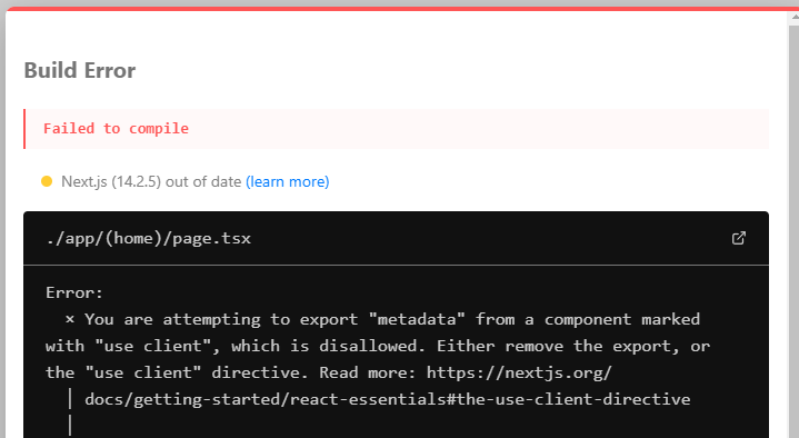 오류를 뱉어낸다. metadata를 use client로 표시한 컴포넌트에서 export하려하고있다는 오류였다.
