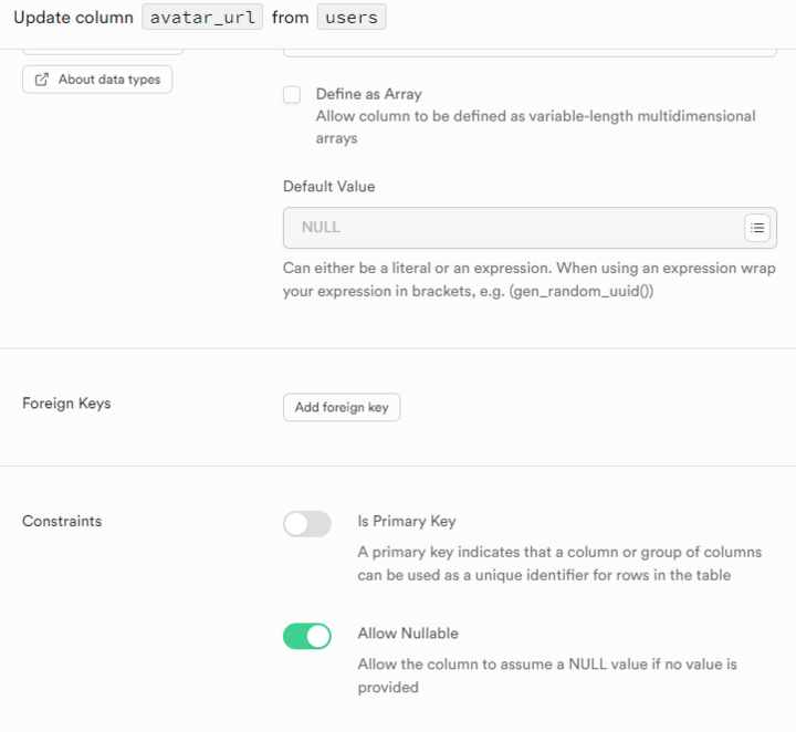 확인해 보니 users테이블의 image_url column이 없는 것과 avatar이 Nullable하지 않은 것이 문제로 파악되어 해당 부분 추가 및 수정