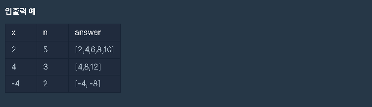 | 함수 solution은 정수 x와 자연수 n을 입력 받아, x부터 시작해 x씩 증가하는 숫자를 n개 지니는 리스트를 리턴해야 합니다. 다음 제한 조건을 보고, 조건을 만족하는 함수, solution을 완성해주세요. |