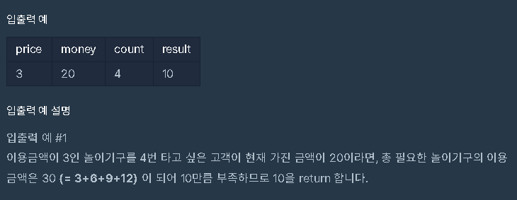 | 놀이기구의 이용료 price : 1 ≤ price ≤ 2,500, price는 자연수 처음 가지고 있던 금액 money : 1 ≤ money ≤ 1,000,000,000, money는 자연수 놀이기구의 이용 횟수 count : 1 ≤ count ≤ 2,500, count는 자연수 |