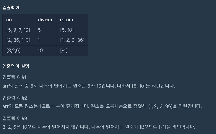 | array의 각 element 중 divisor로 나누어 떨어지는 값을 오름차순으로 정렬한 배열을 반환하는 함수, solution을 작성해주세요. divisor로 나누어 떨어지는 element가 하나도 없다면 배열에 -1을 담아 반환하세요. |